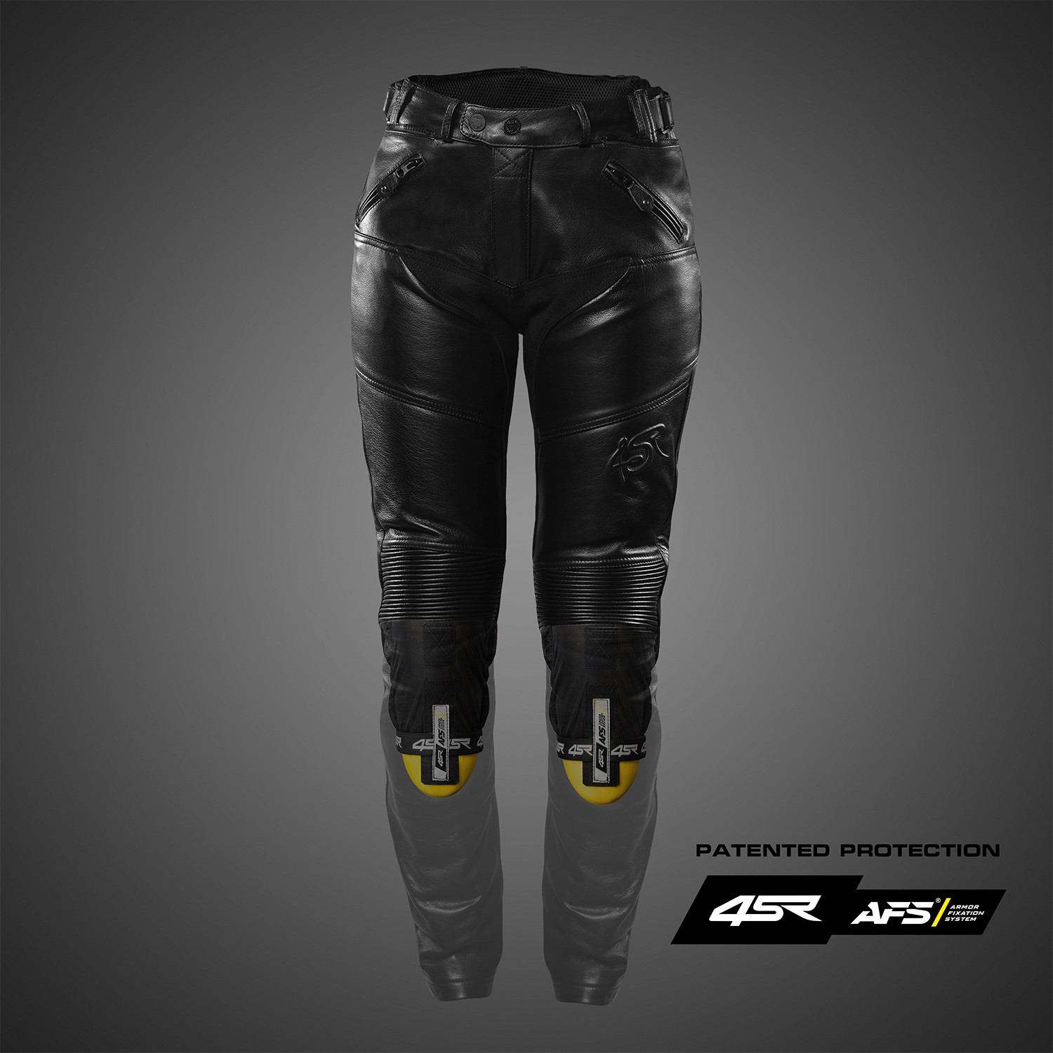 Po raz pierwszy również w modelu damskim stosujemy nasz opatentowany system A.F.S. – Armor Fixation System® do mocowania trójwymiarowego ochraniacza kolana i piszczeli. Ochraniacz nie jest jedynie umieszczony w kieszeni ani przyszyty na stałe. Znajduje się w osobnej wewnętrznej „nogawce”, która jest wszyta w nogawkę spodni skórzanych, ale nie jest bezpośrednio zależna od jej ruchu.
