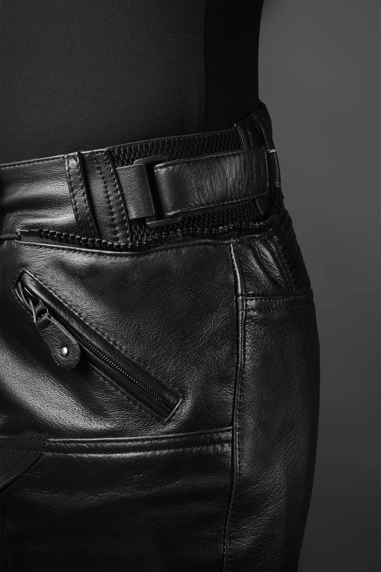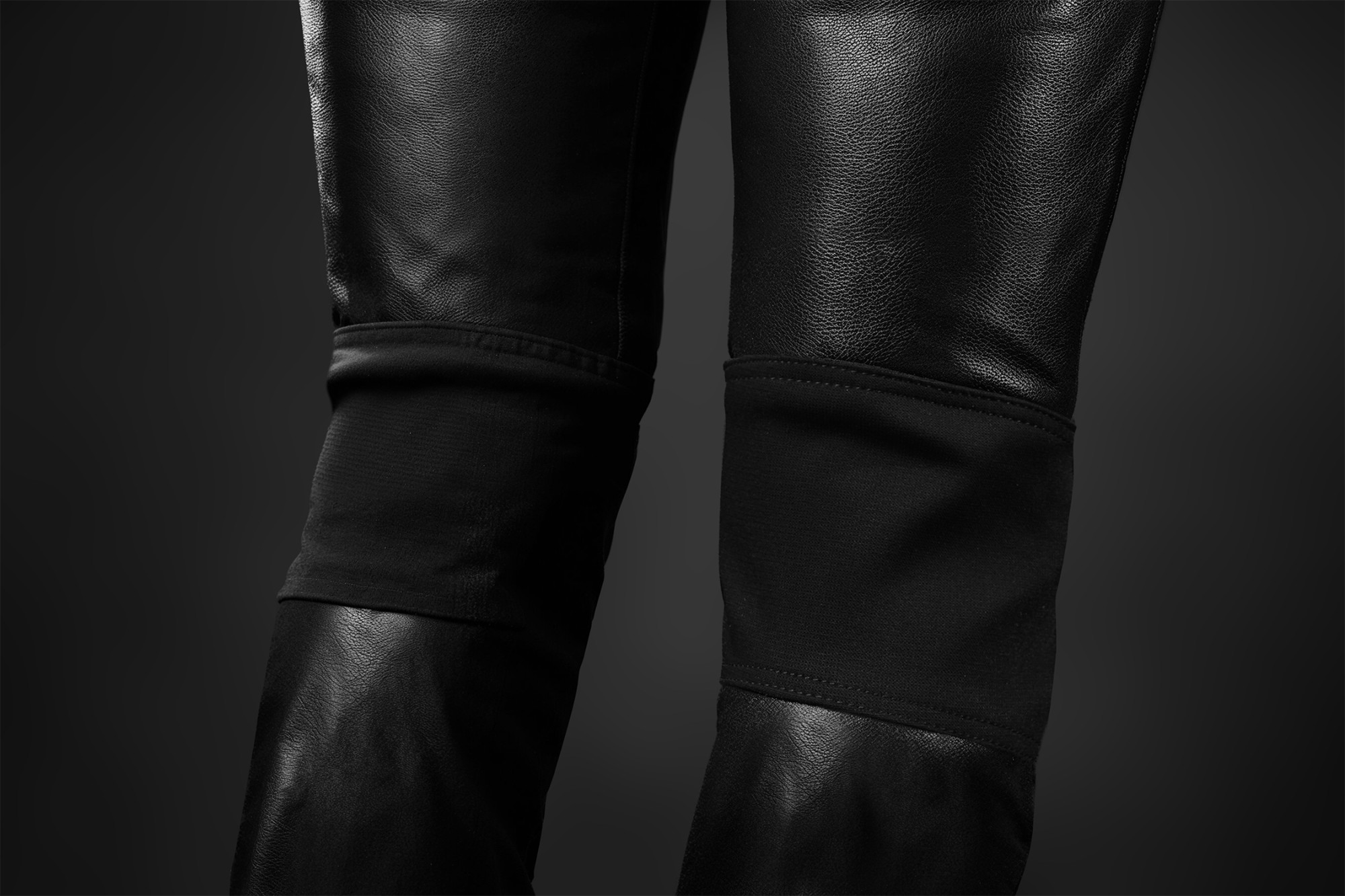 Opatentowane mocowanie ochraniaczy w skórzanych spodniach.